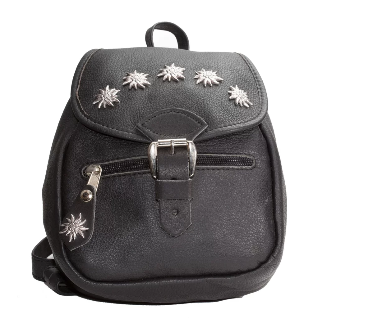 Klein und fein ist dieser Rucksack. Lässig über der Schulter oder am Rücken getragen, bleiben die Hände auf dem Velo oder beim Spaziergang frei und die wichtigsten Dinge sind sicher verstaut. In verschiedenen Lederfarben und mit Edelweiss oder mit Folklore Motiven lieferbar. Sie haben die Wahl.
