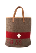 Die eingewobenen Zahlen und Buchstaben auf diesem Shopper zeigen wann und von wem diese Schweizer Armee Decke hergestellt wurde. Es kann gut sein, dass diese Decke älter ist als die Taschenträgerin. Das zeigt wie solide und strapazierfähig die Wolldecken sind. Dank dem robusten breiten Lederboden und der Grösse der Tasche passen anderthalb Literflaschen und noch so einiges mehr in diese Tasche.