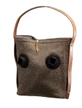 Der Doppeltrageriemen aus Leder wird durch hochglanz Metallringe geführt. Diese sind ein schöner Kontrast zu der robusten Schweizer Armee Decke. Die Beutelform hat ein gutes Fassungsvermögen und ein Blickfang sind auch die Leder-Ecken. Durch die verstellbaren Schulterriemen kann sie als Bowling-Bag oder als Umhängetasche getragen werden.