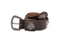 Mehrerer Edelweisse in antik-Optik macht sich dieser Gurt aus anschmiegsamen, robusten Rindsleder in der Casual-Hose, wie einer Jeans gut. Ein Gürtel, der Mann wie Frau jahrelanges begleitet und in fast keiner Garderoben-Grundausstattung fehlen sollte.