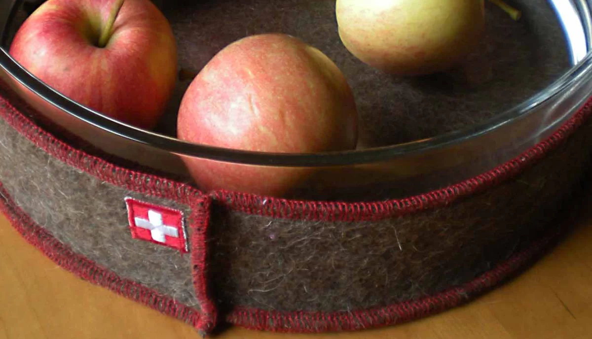 Ein nicht alltäglicher Topflappen der bei nicht gebrauch einen schönen Untersetzer abgibt. Der Kuchen lässt sich sicher aus dem Ofen nehmen und der Topflappen muss, soll nicht in einer Schublade verschwinden. Er ist zugleich ein dekoratives Deckchen. Streifen aus Schweizer Armee Wolldecken wurden dicht aneinander geflochten und umsäumt. Dies ergibt eine originelle Optik. Auch ein sehr schönes Geschenk