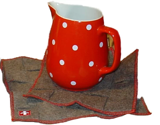 Ein nicht alltäglicher Topflappen der bei nicht gebrauch einen schönen Untersetzer abgibt. Der Kuchen lässt sich sicher aus dem Ofen nehmen und der Topflappen muss, soll nicht in einer Schublade verschwinden. Er ist zugleich ein dekoratives Deckchen. Streifen aus Schweizer Armee Wolldecken wurden dicht aneinander geflochten und umsäumt. Dies ergibt eine originelle Optik. Auch ein sehr schönes Geschenk