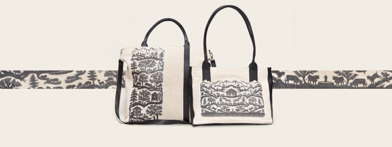Die Szene eines einzigartigen Scherenschnitts auf einer Leinentasche gedruckt. Das Auge kann sich kaum satt sehen.