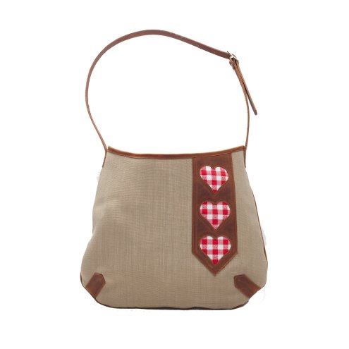 Oben ist diese Schultertasche etwas schmaler als unten. Dies verleiht ihr ein elegantes Aussehen. Gepaart mit dem Traditionellen Muster aus Herzen oder Edelweiss ist diese Umhängetasche bei jungen und älteren Damen ein Renner. Der rundum Ledertrageriemen und die angenähten Lederlaschen betonen die nicht ganz alltägliche Form dieser Tasche.