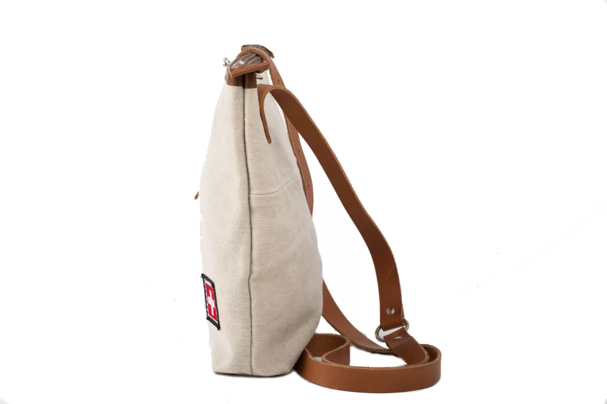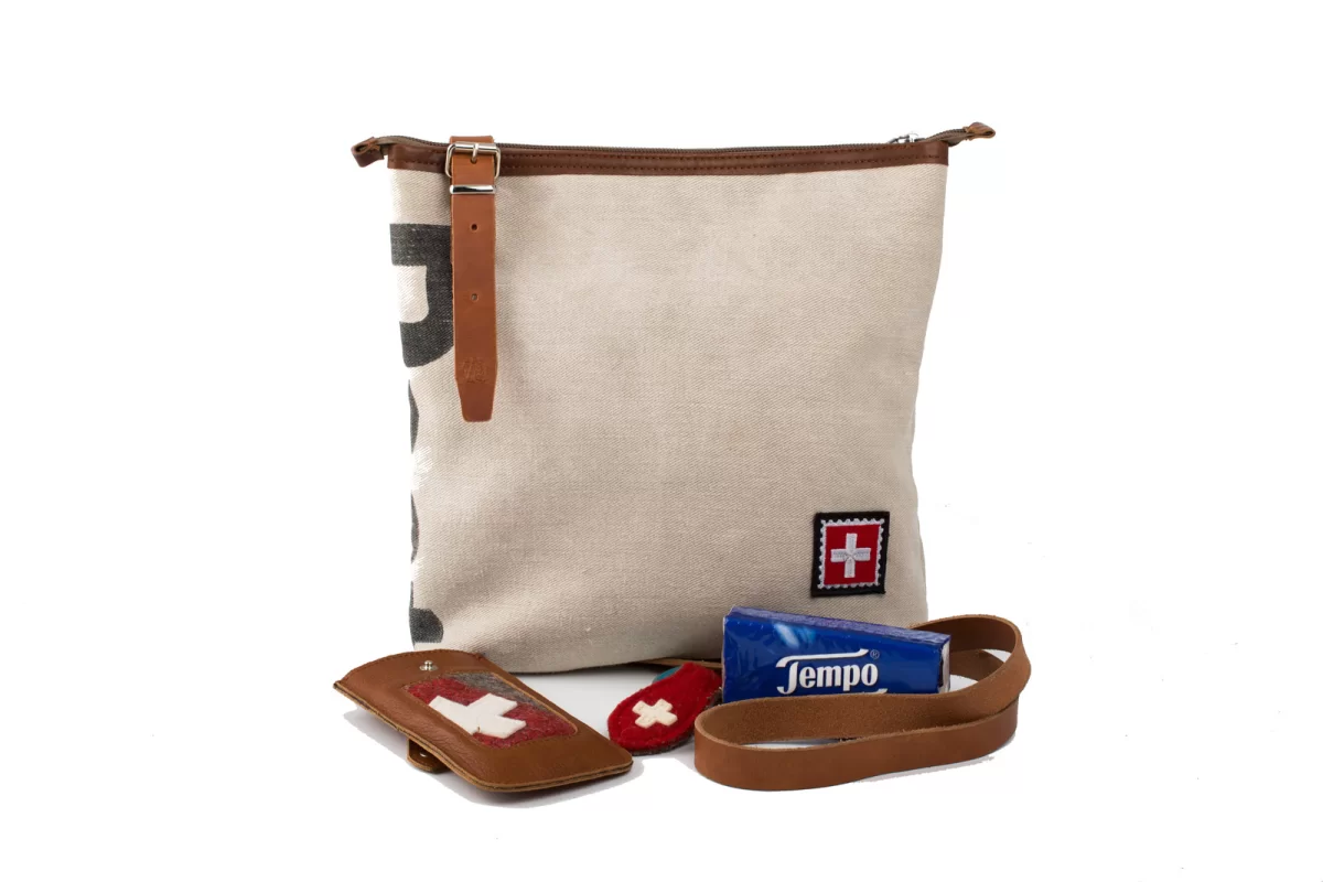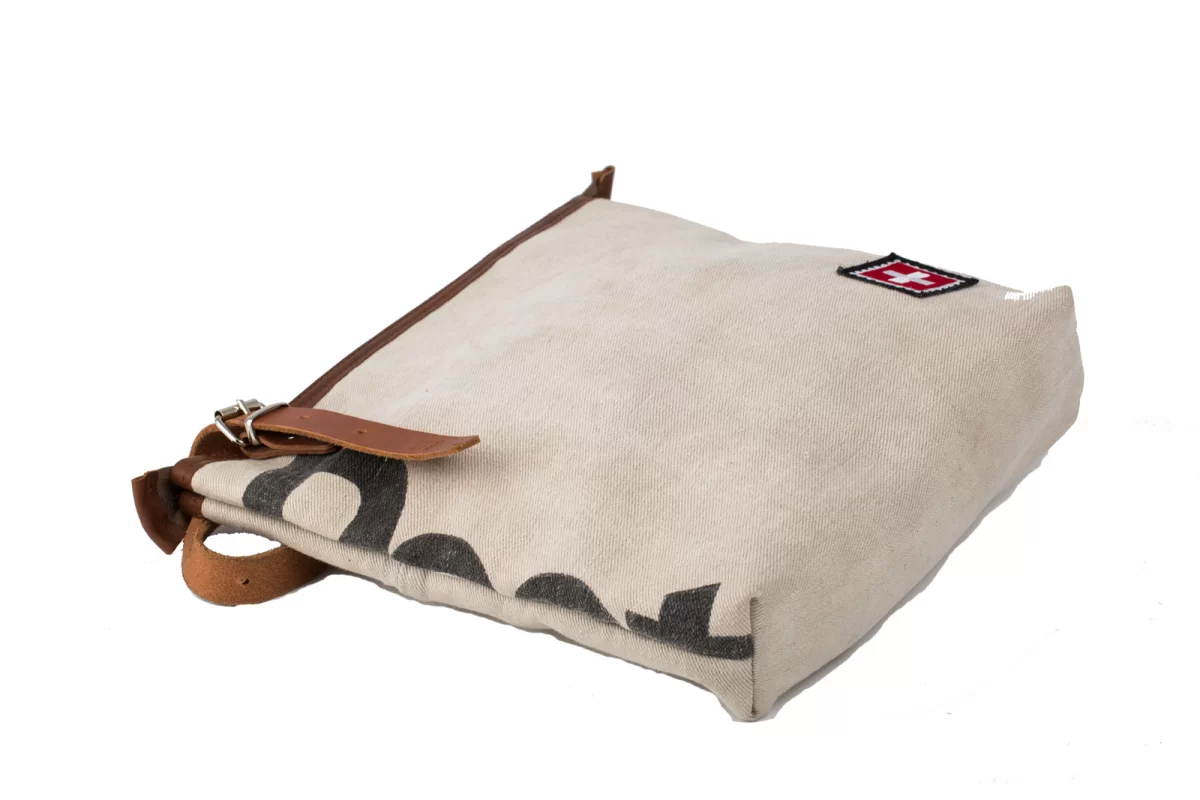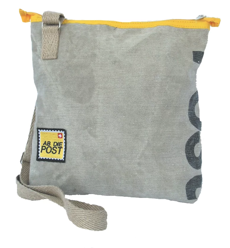 Schlank liegt diese Umhängetasche am Körper weil, die Träger Cross angenäht sind. Ein Highlight dieser Tasche ist der Post Schriftzug in der Naht und die kleine „Briefmarke“ in der Ecke. Sie stammt auch aus Original-Postsäcken.