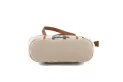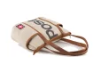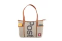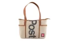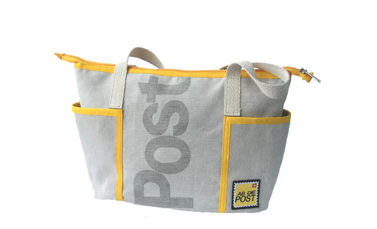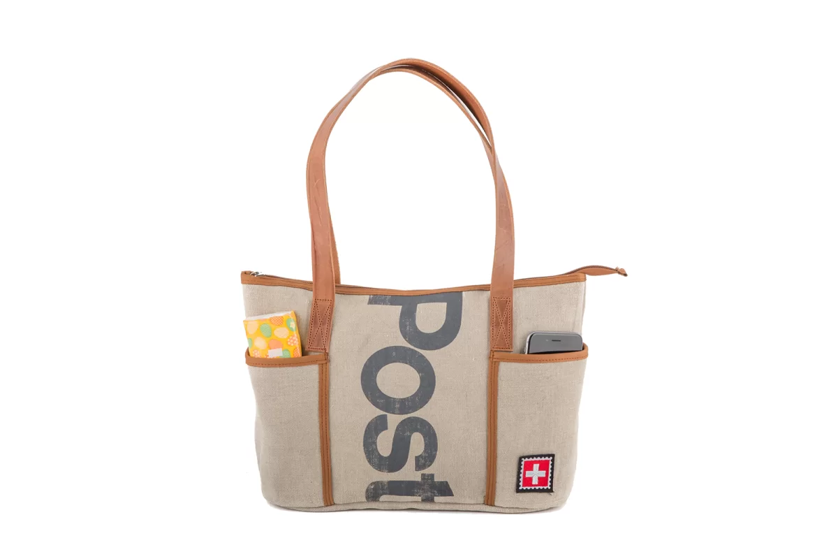 Zum Material passend ziert ein Patch in Form einer Briefmarke Eine Ecke der Tasche.