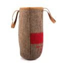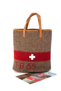 Die eingewobenen Zahlen und Buchstaben auf diesem Shopper zeigen wann und von wem diese Schweizer Armee Decke hergestellt wurde. Es kann gut sein, dass diese Decke älter ist als die Taschenträgerin. Das zeigt wie solide und strapazierfähig die Wolldecken sind. Dank dem robusten breiten Lederboden und der Grösse der Tasche passen anderthalb Literflaschen und noch so einiges mehr in diese Tasche.