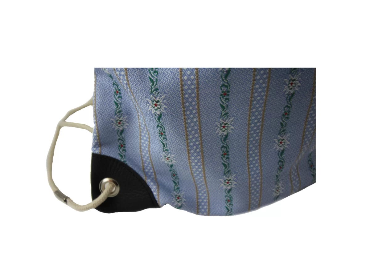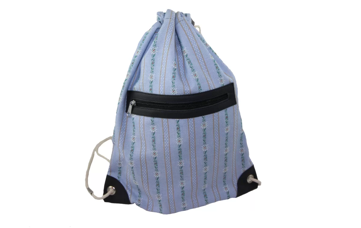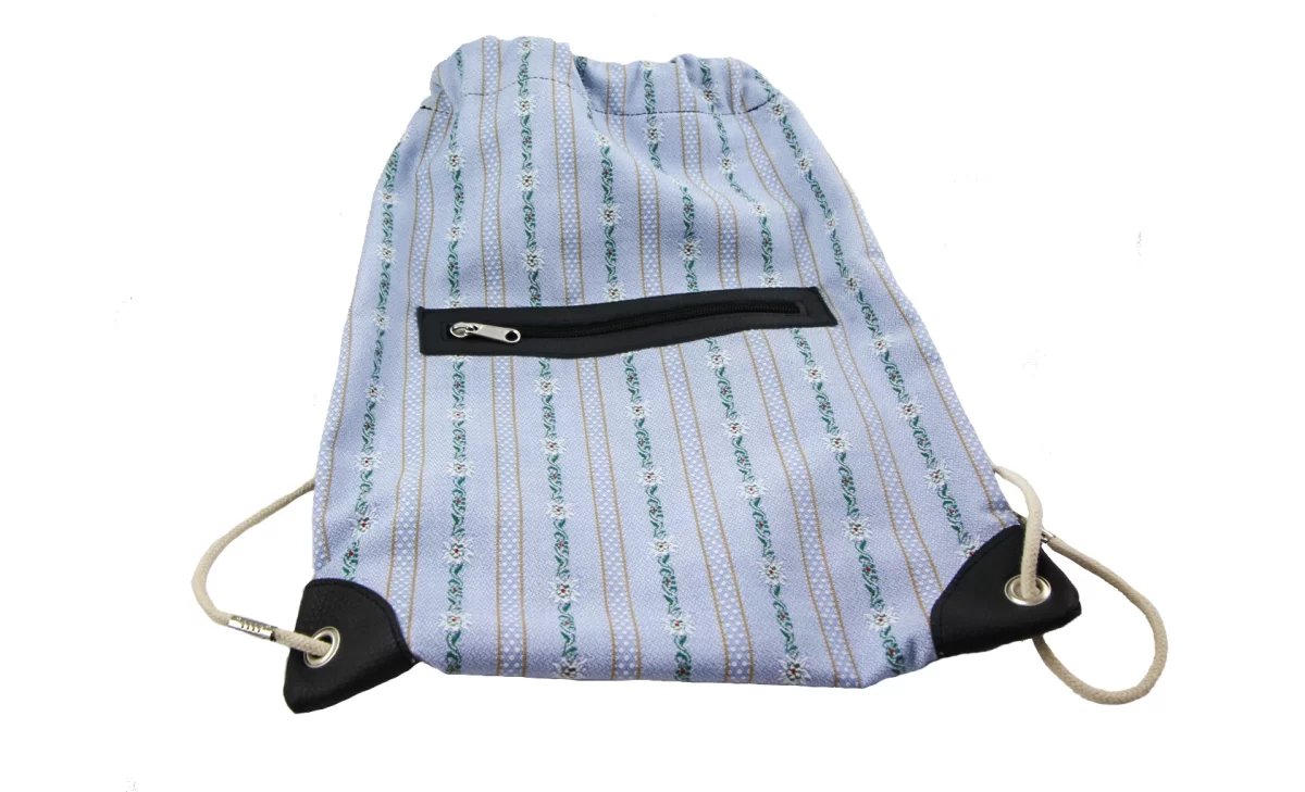 Dieser Turnrucksack ist mehr als ein einfacher Turnsack, er ist schon mehr Rucksack. Mit seinem Aussen-Reissverschluss-Fach sind Schlüssel, Handy und Co. sofort griffbereit. Blickfang ist auch das solide verarbeitete Leder um den Reissverschluss und die Leder verstärkten Ecken. Beides in einem satten Marineblau, schön passend zu dem traditionellen Folklore-Stoff.
