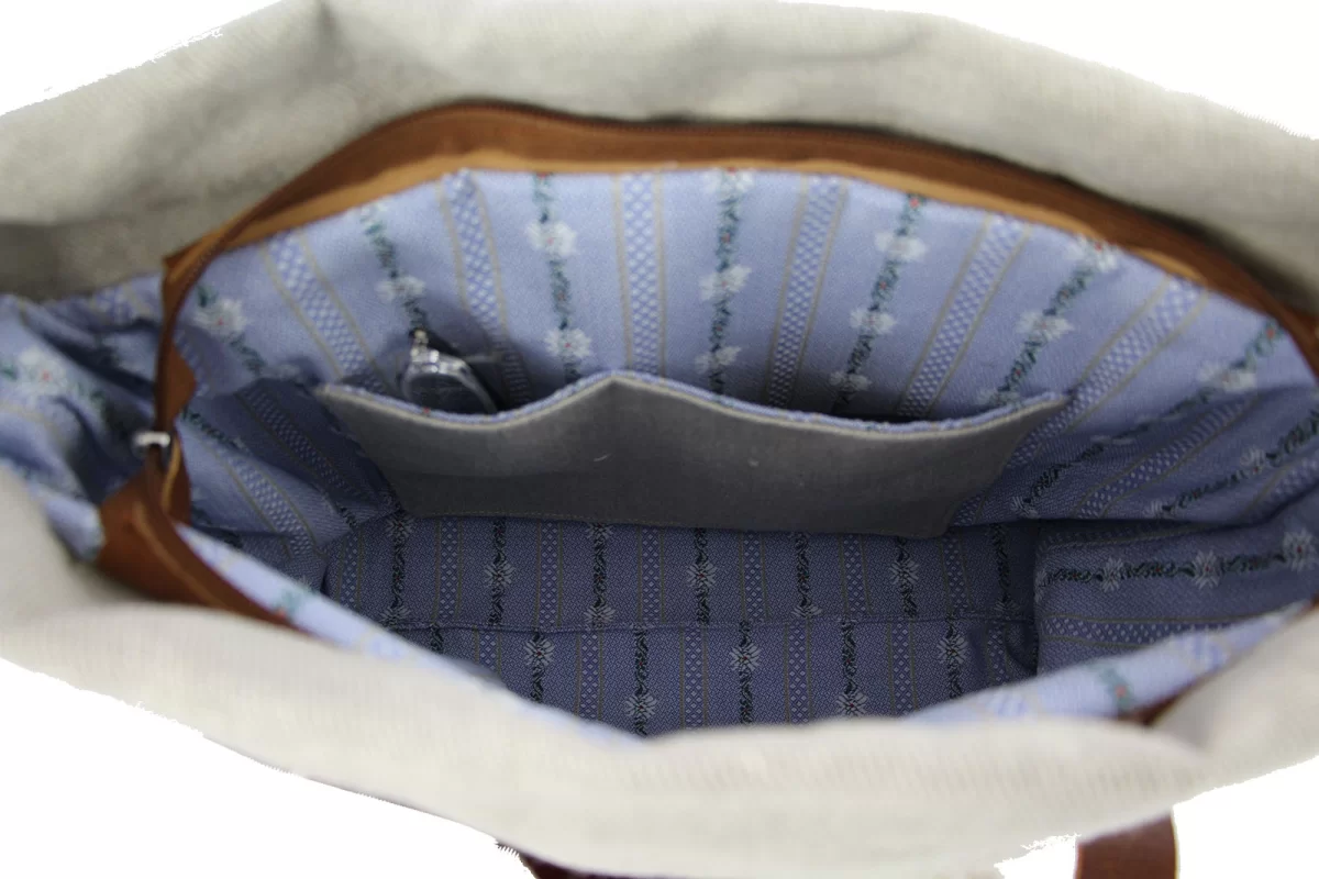 Tasche – Schwingerhose! Was haben diese beiden gemeinsam? Den Stoff. Beide sind aus solidem Zwilch hergestellt. Das lässt erahnen wie strapazierfähig diese Tasche ist. Mit den Lederapplikationen erinnert sie auch fast ein wenig an Schwingerhosen. Ordner, der kleine Einkauf und ander wichtige Dinge finden Platz in der Tasche die lässig mit zwei Trägern über der Schulter getragen werden kann.