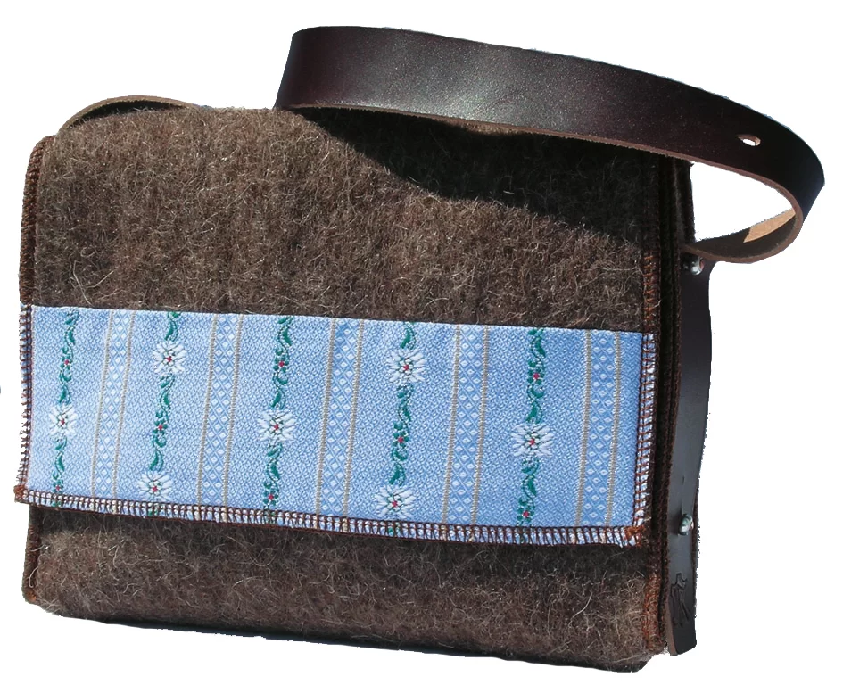 Eine Umhängetasche die Fans von Edelweiss Stoff und Fans von Wollfilz begeistert. Wollfilz ist allerdings nicht gleich Wollfilz. Dieser Filz war mal eine Schweizer Armee Decke! Nicht nur traditionell veranlagten Menschen sind begeistert von dieser Schultertasche. Auf dem Fahrrad als Kuriertasche getragen sieht sie ziemlich stylisch aus.