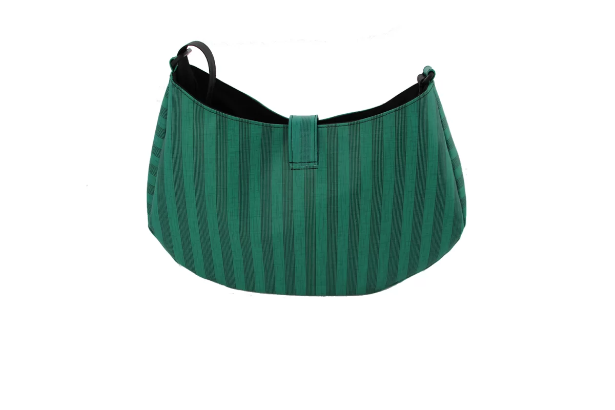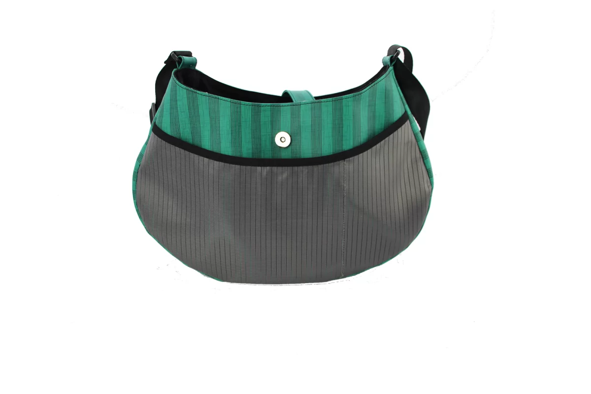 Bei dieser Tasche sind Form und Material nicht alltäglich. Die moderne Form steht in Kontrast zum Traditions behafeten Material. Die Kollektion heisst nicht von ungefähr "Zugvögel" Das Material erinnert die etwas Älteren Kunden an Sitzbezüge in den Wagons von früher. Vielleicht kommt ja auch die Erinnerung an einen Schulausflug hoch. Es war ein Fest die Sonnestoren immer wieder runter zu ziehen und hochspringen zu lassen. Jetzt findet es sich wieder in der Zugvögle-Kollektion. Die Tasche ist innen mit schwarzem Baumwollstoff gefüttert. Sie organisiert die Schlüssel mit einem Band und die anderen wichtigen Utensilien mit einer kleinen Reissverschluss Innentaschen.